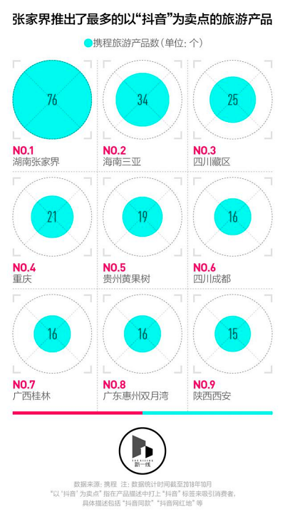 新一线分析了携程平台上与抖音相关的产品,发现携程和一些旅游商家针对张家界、三亚、惠州等目的地推出了以抖音为卖点的旅游产品,这些城市或景点都有视频上榜城市相关热门视频Top100。